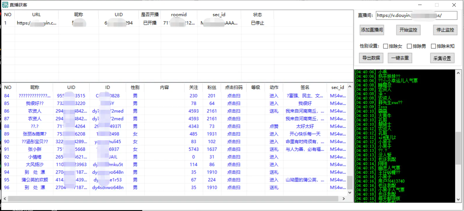 任意直播间采集实时弹幕信息,弹幕用自己抖音扫码直接可私信对方,可以导出弹幕数据。