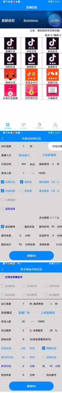 利用脚本进入抖音及快手直播间抢红包,脚本全自动抢红包,单号一天5-10左右,目前无风控,无风险(新号先养一养再操作),多号多撸,适合工作室可放大操作的项目