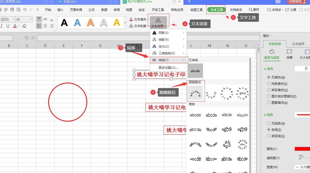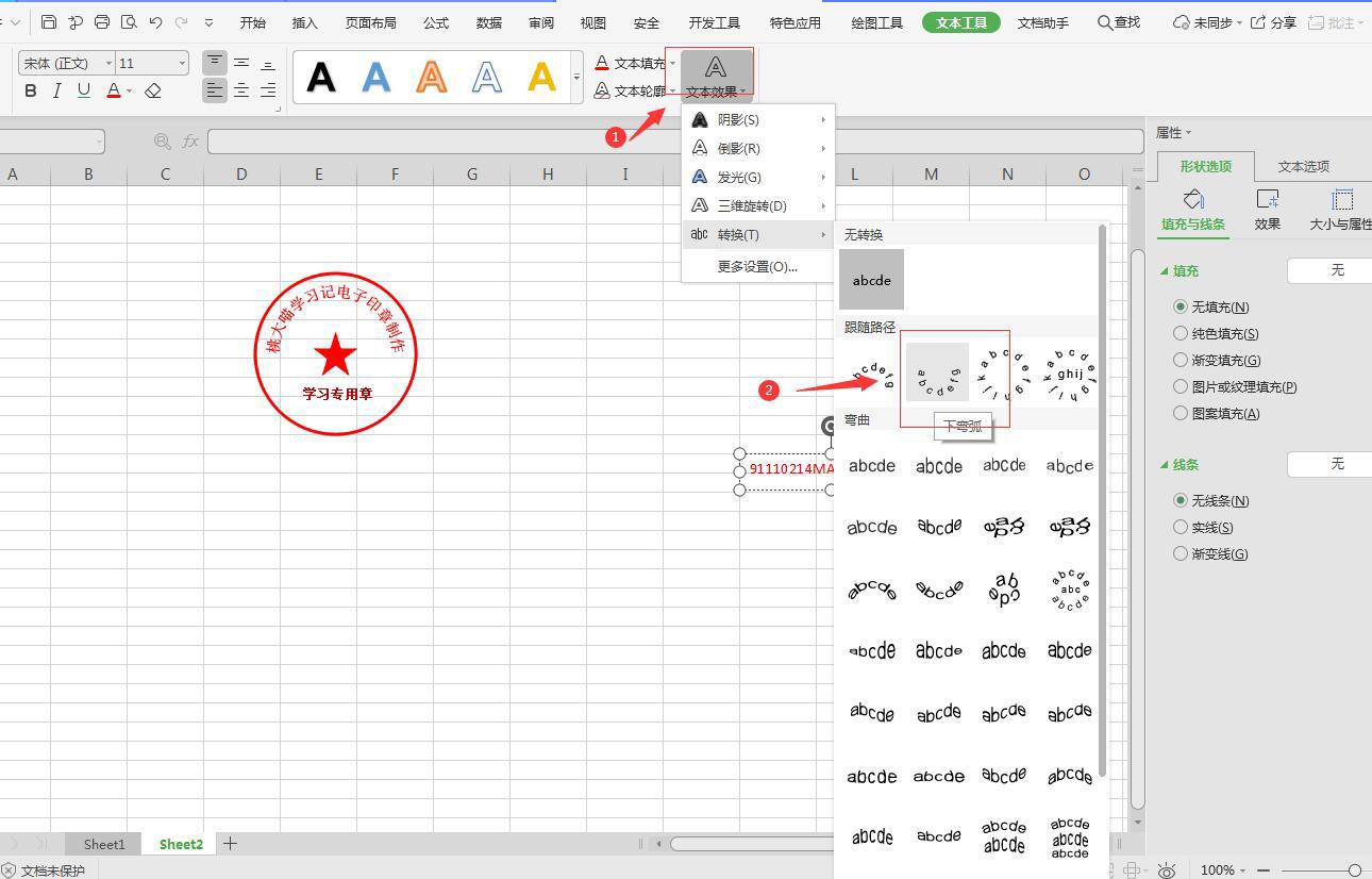 3、为印章编号设置文字效果,“文本工具”-“文字效果“-“转换”-“跟随路径”-下弯弧,最后放到合适的位置。