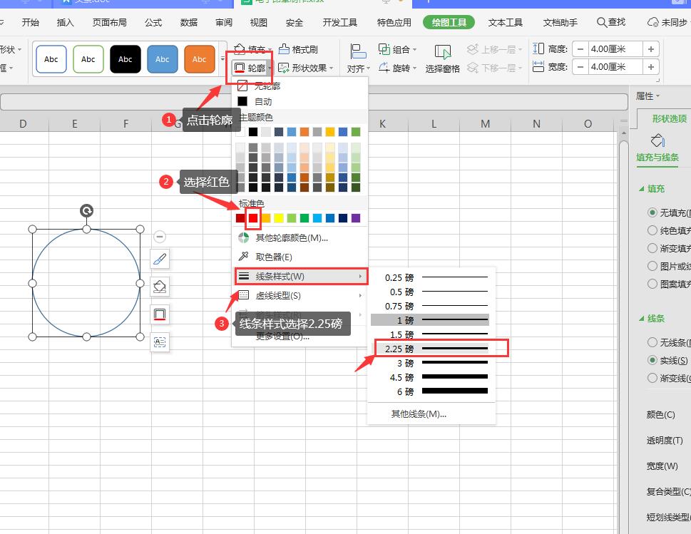 4、轮廓选择红色,线条样式选择2.25磅