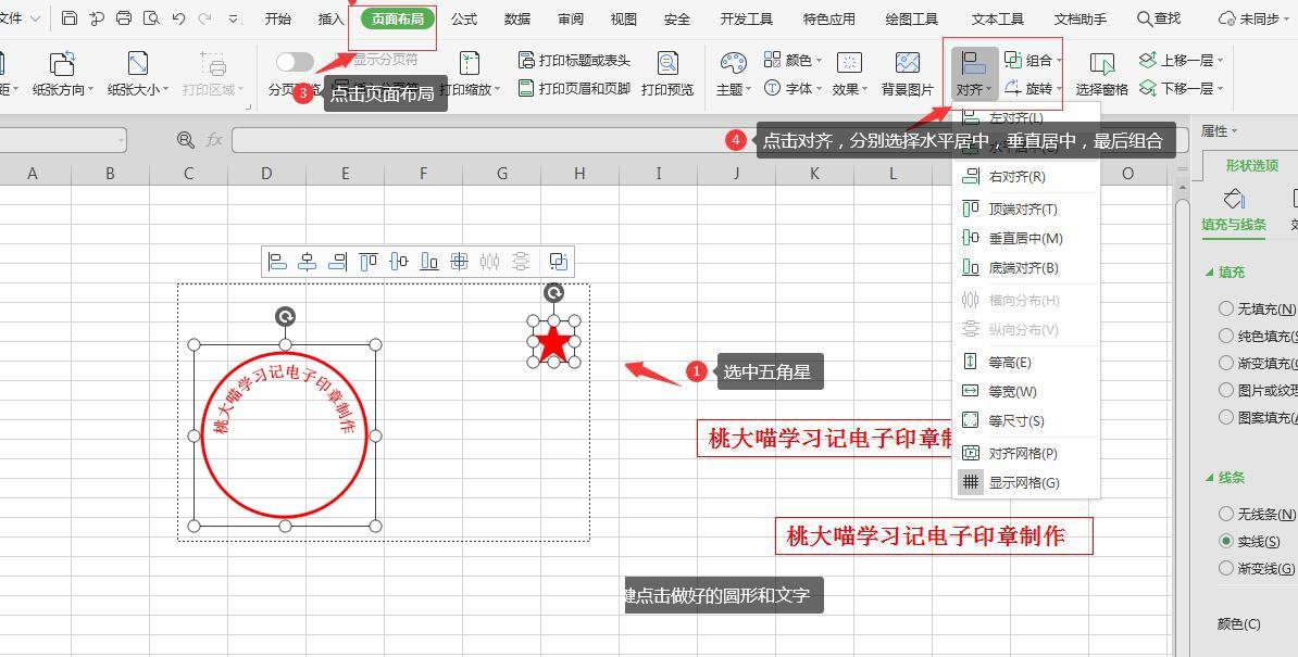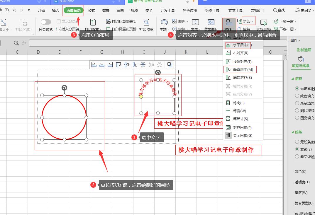 7、选中印章文字,按Ctrl键,点击已经制作好的圆形,点击“页面布局”-“对齐”-分别选择“水平居中”和垂直居中-最后“组合”