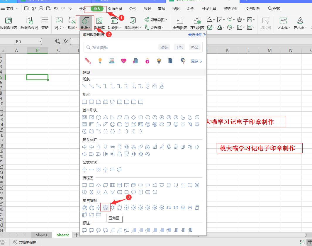 1、通过“插入”-“形状”-“星与旗帜”中的五角星,绘制五角星