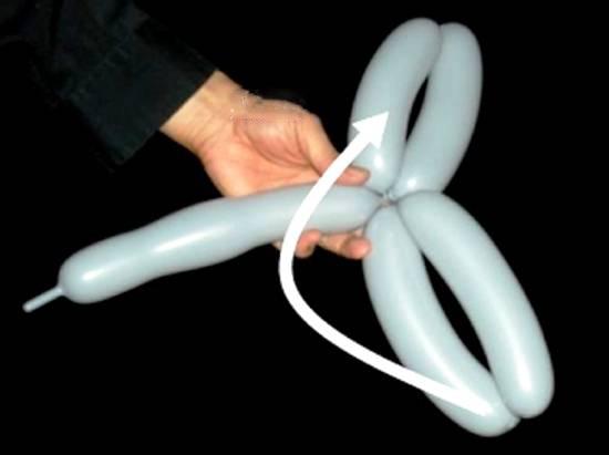 3,在右手的手指处来一个基本扭,然后将这个扭点压到刚才的2/3处,构成的左右两个大小不同的翅膀,这时,气球就有点像蜻蜓了。