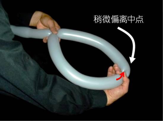 2,左手抓住扭点上,右手抓住气球环相对的一端,将气球环分成两半,然后右手朝图中上方挪动大概3厘米,让圆周分成不相等的两部分