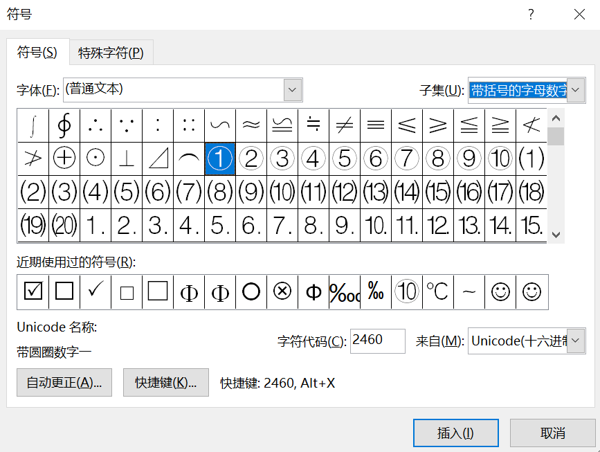 在Word中,进入「插入」-「符号」-「其他符号」,在右侧「子集」中选择「带括号的字母数字」,然后,我们就能够看到带圈数字了,选中后,点击插入即可。