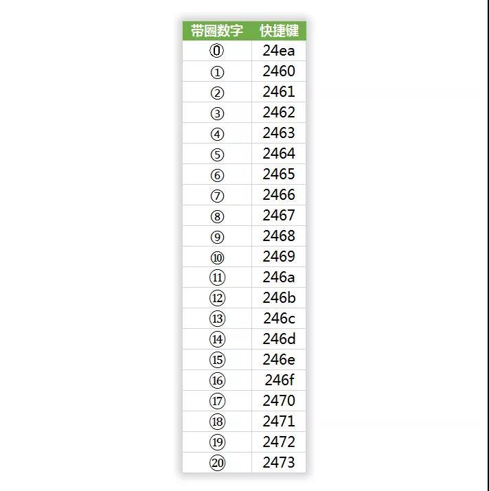 这里,为了方便大家,我们将从0~20带圈数字的快捷键代码全部整理出来了,大家要用的时候,直接输入代码后,按下组合件「ALT X」即可快速获取带圈数字。