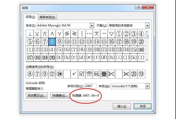 那么,这些属于什么快捷键呢?它又是怎么来的呢?我们进入「插入」-「符号」-「符号」-「其他符号」,将「子集」选择为「带括号的字母数字」,将「字体」选为「Adobe Myungjo Std M」,我们可以在这里看到①~⑳的带圈数字,如下图所示:我们随便选择一个,在下方,我们可以看到所有的字符其实都是拥有这样一组快捷键的,按照该快捷键,我们就可以快速的输入带圈数字了。