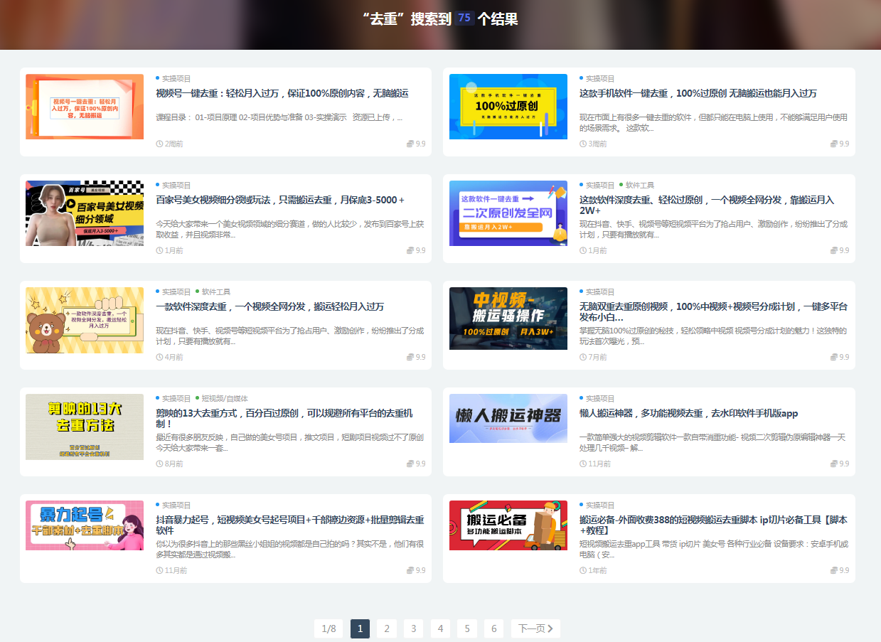 本站搜索关键词【去重】,还有其他不同适用于手机和电脑端的去重软件和各平台的运营教程,都是已经拿到结果的成功经验,发布时卖几百几千的,覆盖当前各主流平台,配上课程,让你少走弯路。