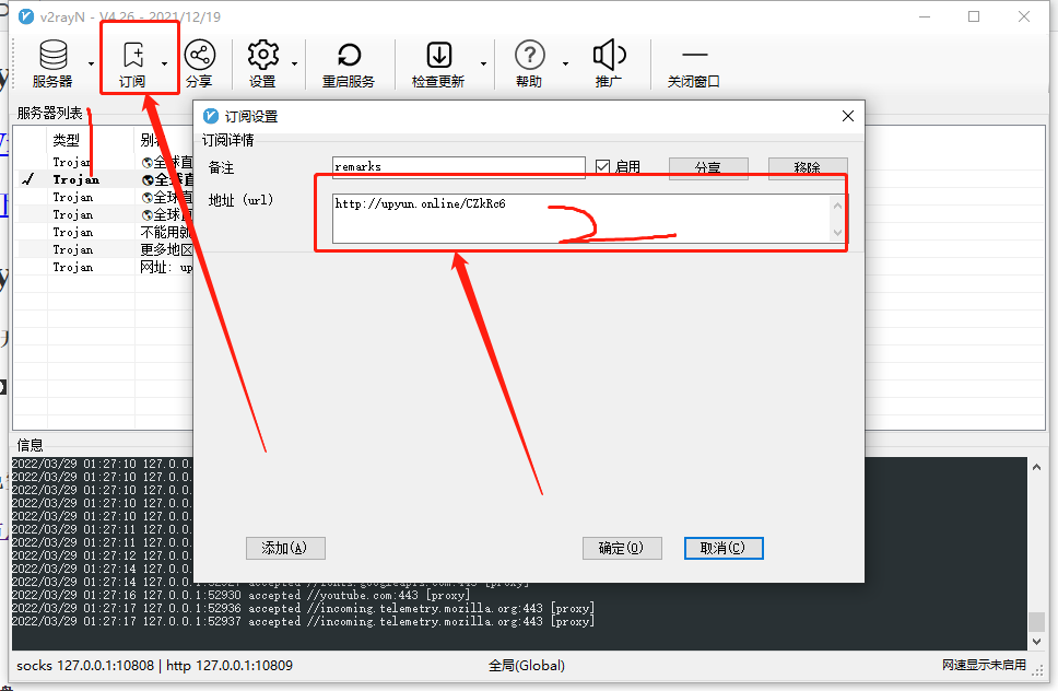 3.点击电脑软件v2ray中的【订阅】–》【更新订阅】就可以看到节点了。选中某一个节点后 按【回车键】即可使用该节点。
