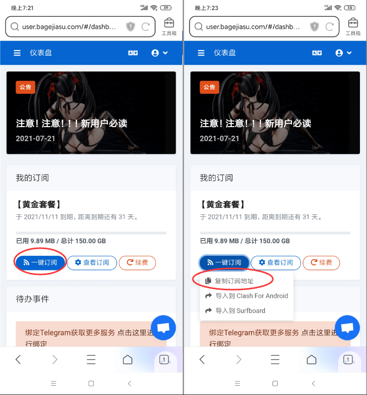 点击左上角三个横杠 – 进入仪表盘 – 点击一键订阅 – 选择复制订阅地址