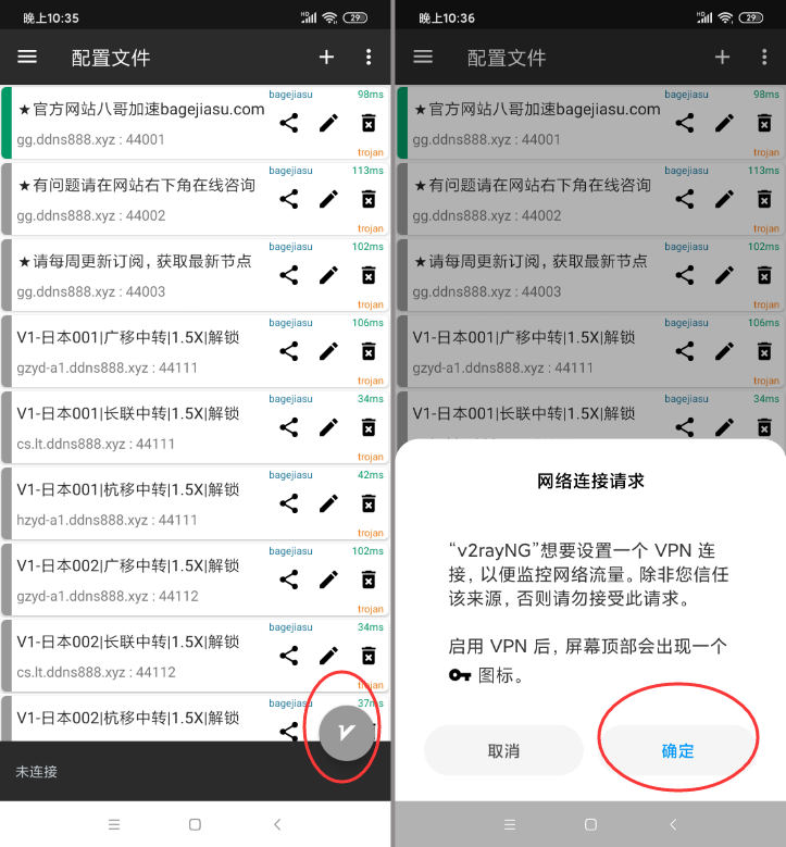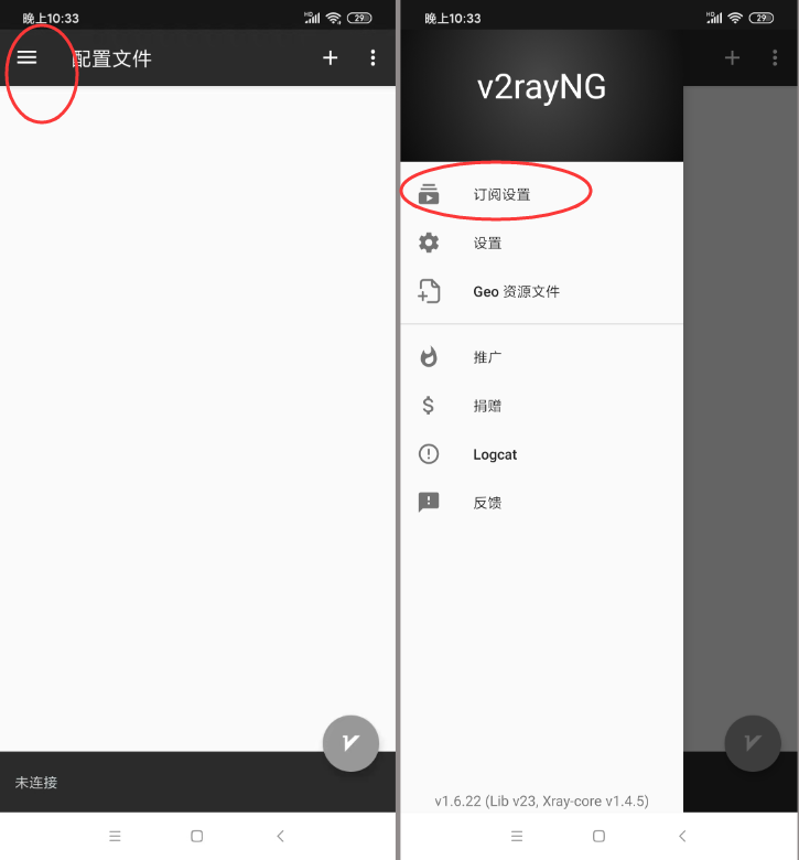 【打开V2ray NG】- 点击左上角三横杠】-【点击订阅设置】