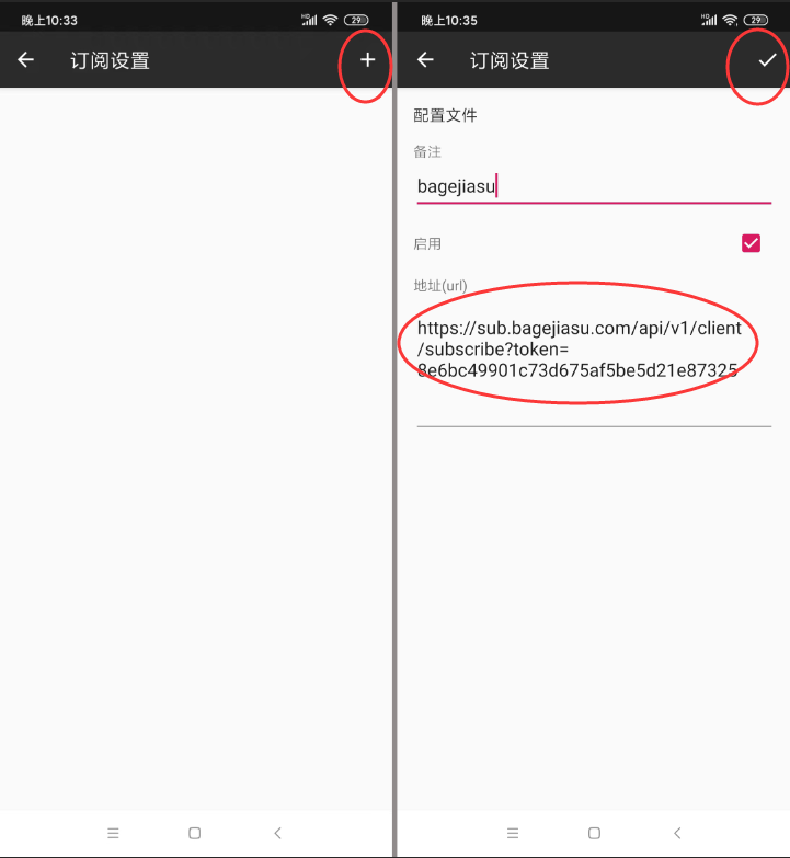 【点击右上角+号】-【把刚复制的订阅地址粘贴到下面一行,备注随便填写】-【点击右上角对号】