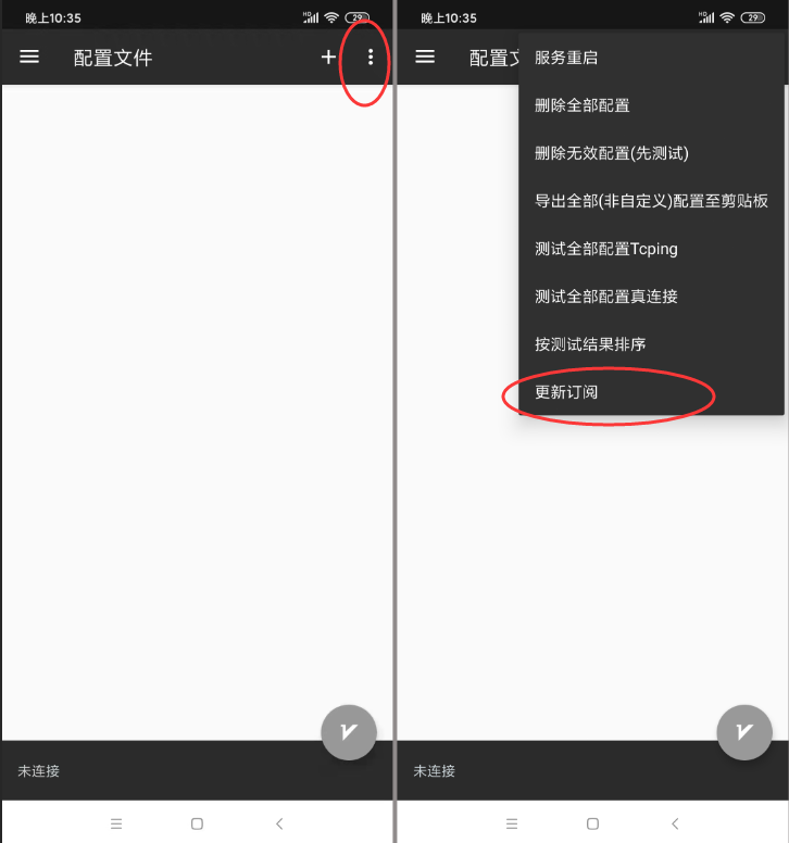 【返回V2首页】【点击右上角三个点】-【更新订阅】