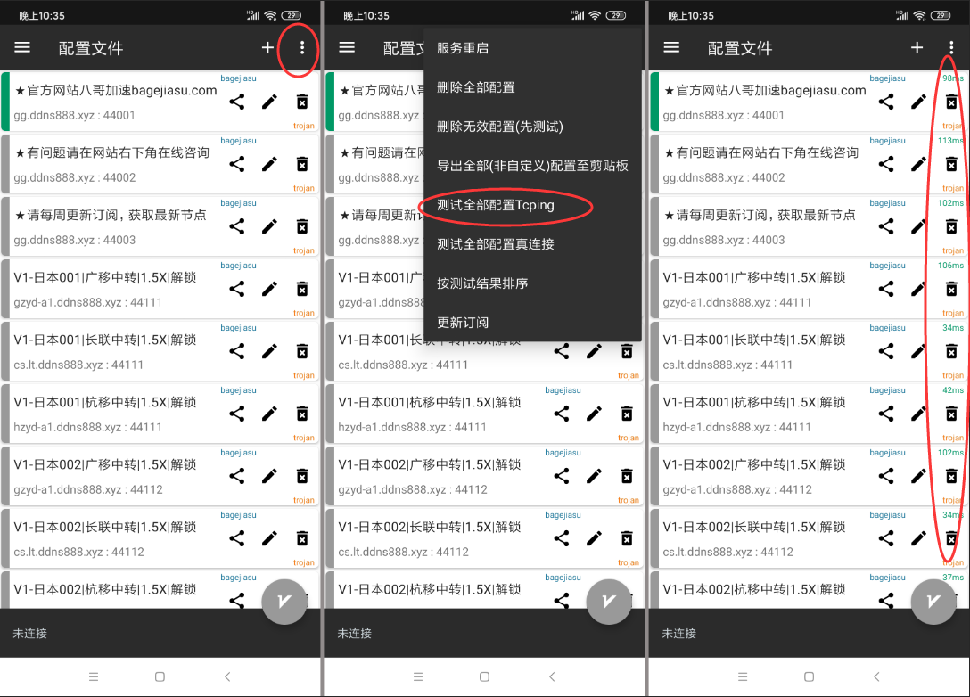 【继续点击右上角三个点】-【测试全部配置Tcping】- 【选择你需要连接的节点】